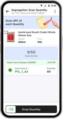 Once an item variant is selected, the segregator drops items into mapped store crates. On scanning an item, the system already knows store-wise quantities and directs exactly where and how many units to drop.
